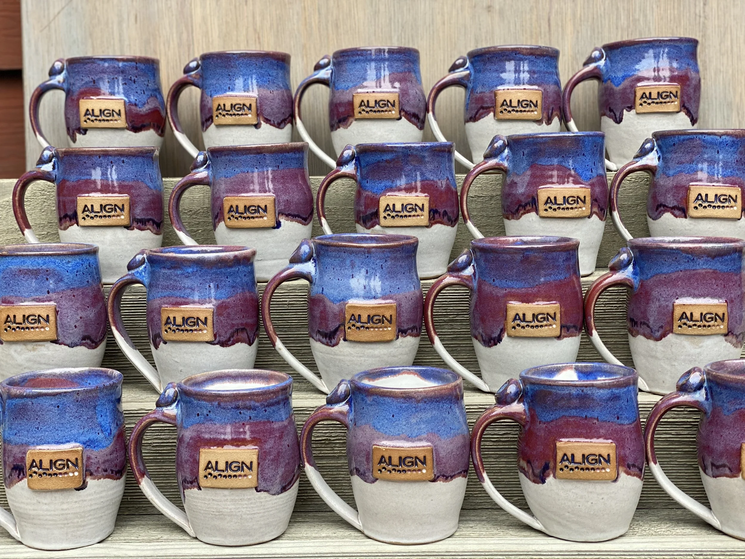 Typically, we make a plastic stamp of your logo. The mug is wheel thrown, and then a clay slab is rolled out and we make and stamped impression of the logo, which is added on to the mug. The logo can be stained or glazed to contrast with the glaze of the mug. Pottery is generally fired twice, unless we use a decal, in which it is fired three times.
